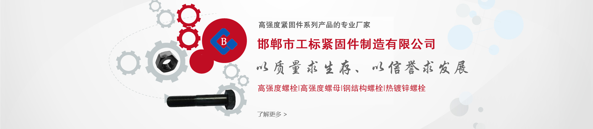 邯鄲市工標(biāo)緊固件制造有限公司位于標(biāo)準(zhǔn)件生產(chǎn)基地---河北省永年縣,是一家專業(yè)研發(fā)及生產(chǎn)鋼高強(qiáng)度緊固件系列產(chǎn)品的專業(yè)廠家。工標(biāo)緊固件公司擁有各類自動(dòng)化生產(chǎn)及檢測設(shè)備,采用進(jìn)口及大型鋼廠原材料,以現(xiàn)代化企業(yè)制度為運(yùn)營機(jī)制,保持產(chǎn)品質(zhì)量。 我們主要產(chǎn)品有:高強(qiáng)度螺栓、高強(qiáng)度螺母、鋼結(jié)構(gòu)螺栓、扭剪型螺栓、塔吊螺栓、高強(qiáng)度加長螺栓、焊釘,鋼結(jié)構(gòu)用大六角頭高強(qiáng)度螺栓連接副、鋼結(jié)構(gòu)用扭剪型高強(qiáng)度螺栓連接副、鋼網(wǎng)架螺栓球節(jié)點(diǎn)用高強(qiáng)度螺栓、高強(qiáng)度內(nèi)外六角螺栓系列,玻璃幕墻T型螺栓,T型槽螺栓,地腳螺栓,雙頭螺栓,四方頭螺栓,各種異型螺栓、熱鍍鋅螺栓、達(dá)克羅螺栓,國內(nèi)外標(biāo)準(zhǔn)各類高強(qiáng)度緊固件,可訂做各種高強(qiáng)度異型件。產(chǎn)品廣泛用于航天、建筑、交通、電力、軍工等行業(yè),經(jīng)過多年發(fā)展,產(chǎn)品質(zhì)量與售后服務(wù)得到了客戶及業(yè)界人士的好評!